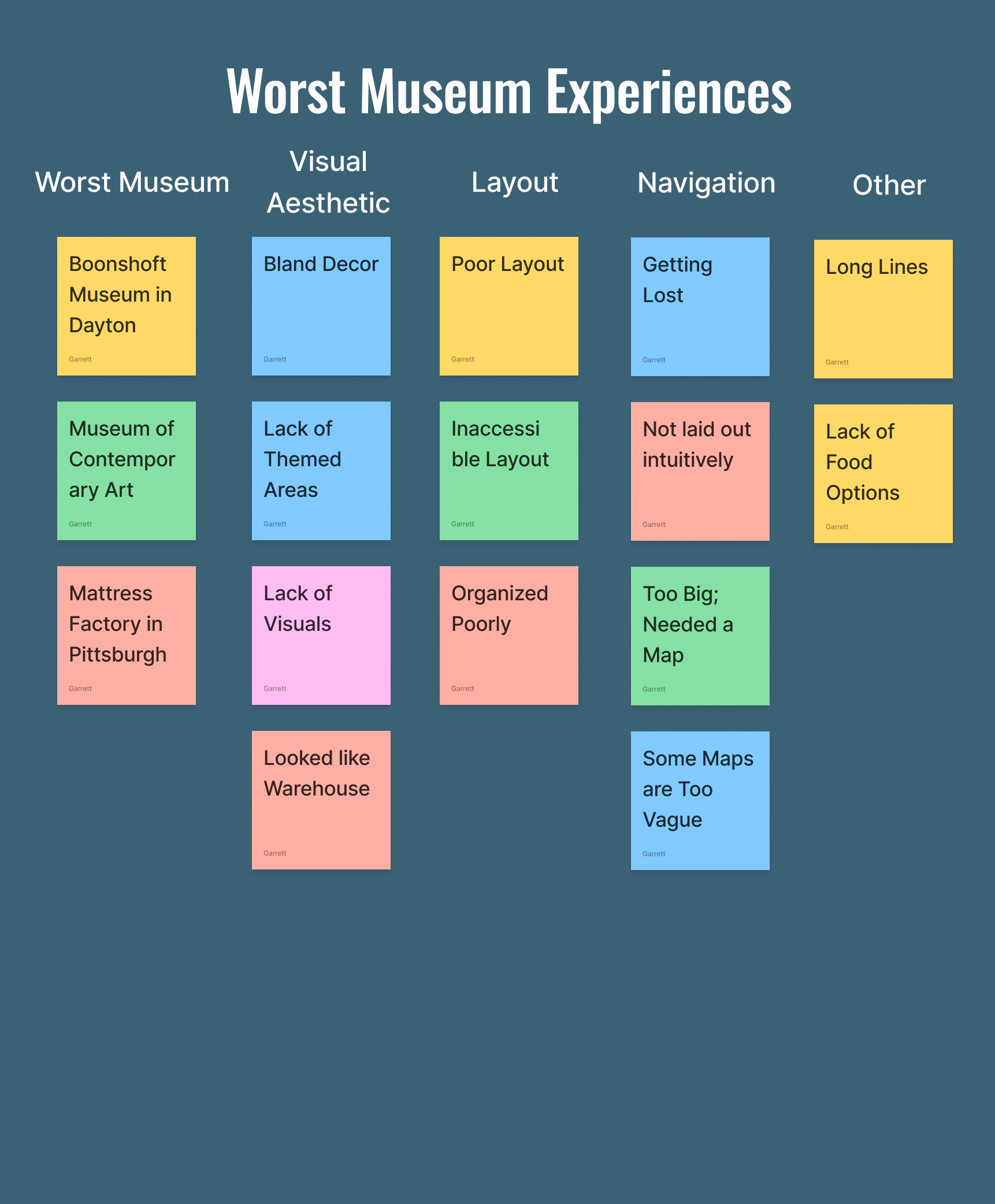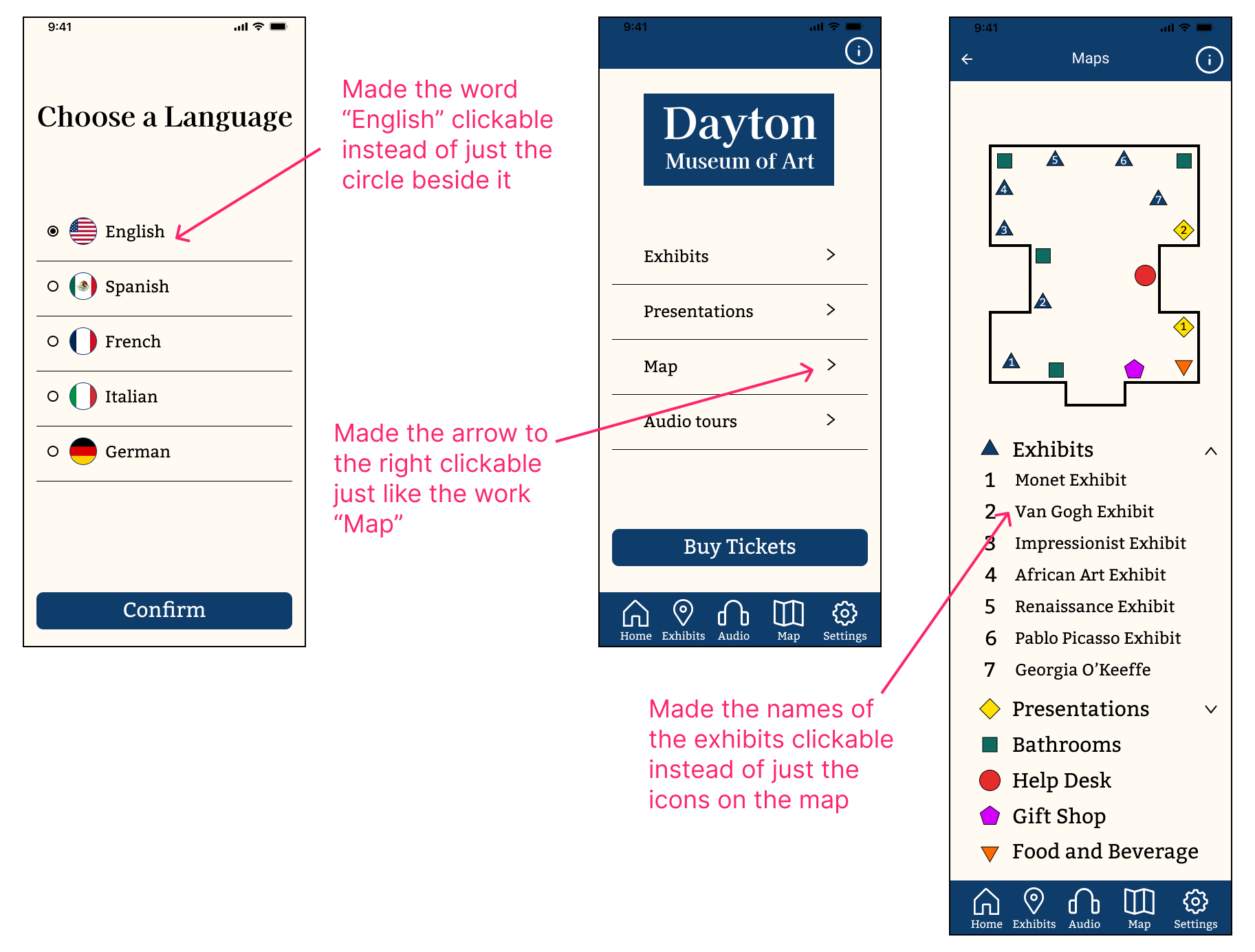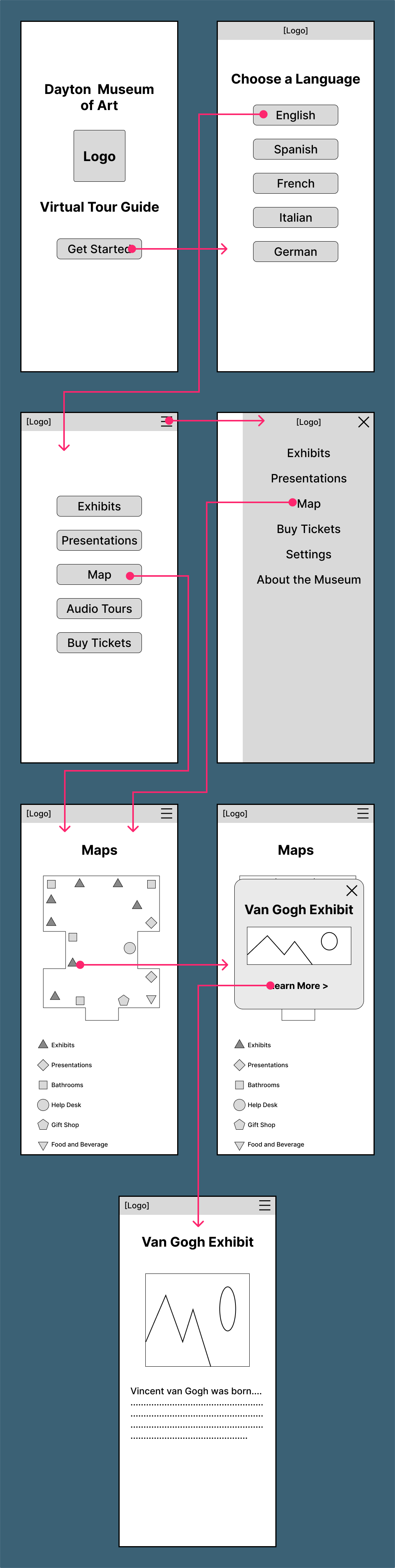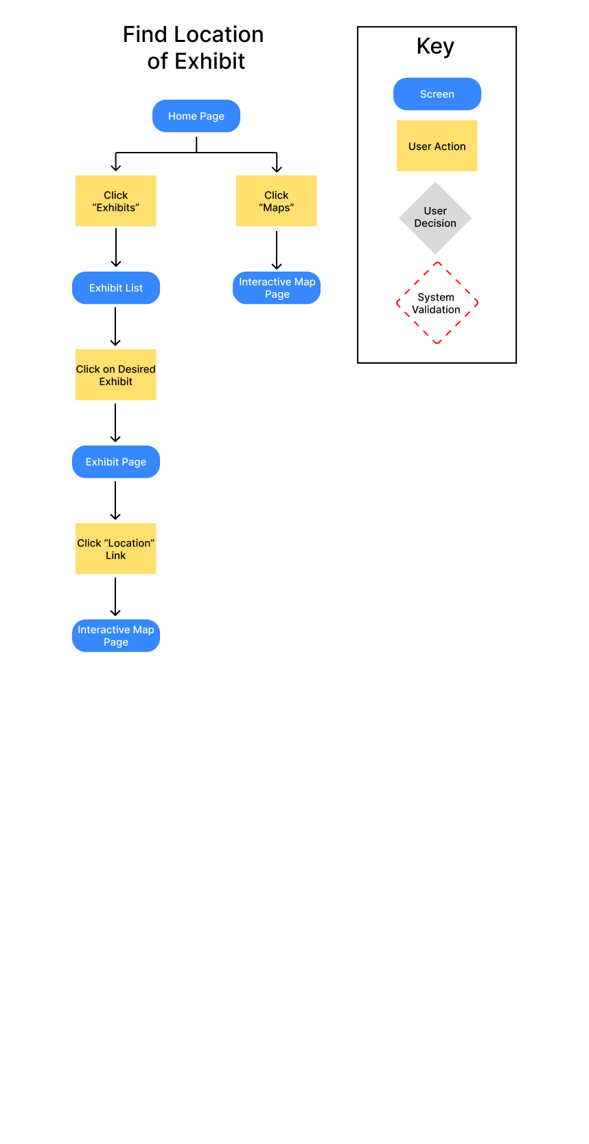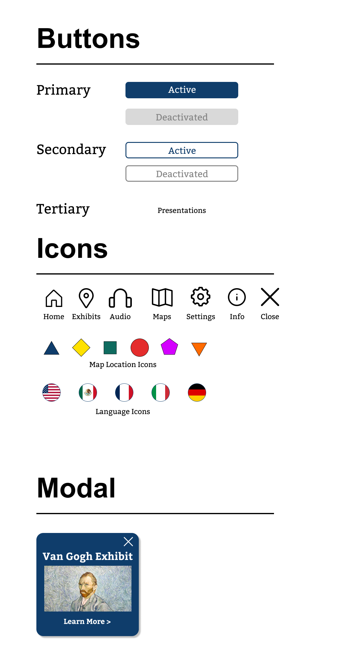 By creating an app that is specific to a particular museum, many of these issues will be solved. Visitors can use it to navigate the very large area of the museum. Parents can use it to find bathrooms and baby changing tables. This will also reduce the number of employees necessary to direct visitors to certain locations and answer common visitor questions. The museum app would have maps of important locations, lists of exhibits, and dates and times for certain special shows and presentations. If the app also included the ability to play an audio recording of information about each exhibit, it would allow people with sight or reading related barriers to still enjoy the exhibits. Figma will be the primary tool used to create, test, and iterate the design and layout of the app.
