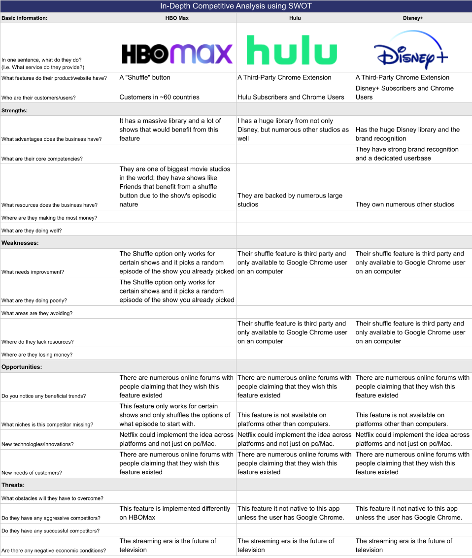 These are three other streaming services that are popular in the United States. Analyzing these allows us to learn from the successes and mistakes of other sites and brainstorm ways to improve upon existing ideas.